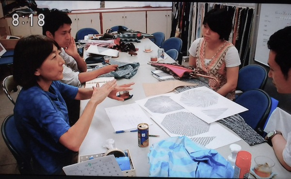 学生時代のプロジェクトの打合せ。特別な組織の織物で傘地を提案。